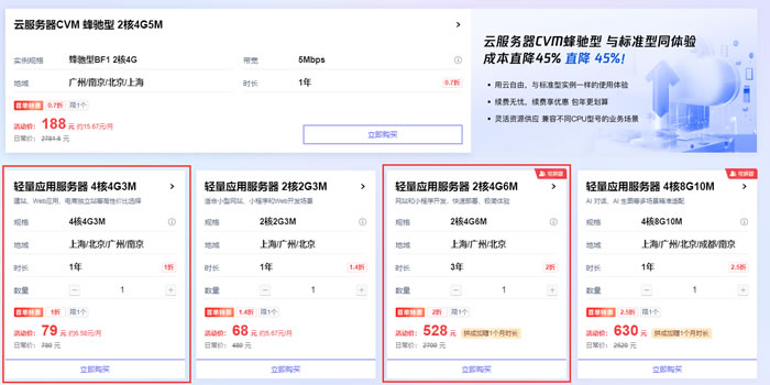 2、云服务器CVM 蜂驰型 2核4G5M,仅188元/年起,轻量应用服务器2核4G6M仅528元/3年起。如果你还没有选择过腾讯云,可以用新用户尝试一下。