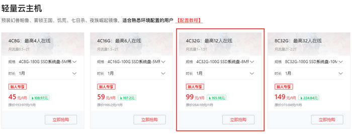2、4核32G10M三个月(6-10人):210成为32G里新史低机型,10M带宽是够用了,建议和阿里271都入3个月轮换着买,这样性价比最高。