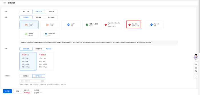 创建实例时请直接选择 OpenClaw 官方镜像版本: