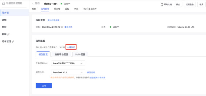 访问openclaw官网网站需要通过18789端口访问,点击“一键放行”放行防火墙18789端口