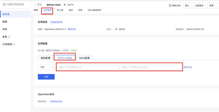 若您需要将openclaw接入飞书/钉钉/企业微信/QQ,您可以点击“消息平台配置”,选择您的目标消息平台,并输入对应的信息,点击“应用”。信息可参考输入框右侧“参考文档”进行获取。