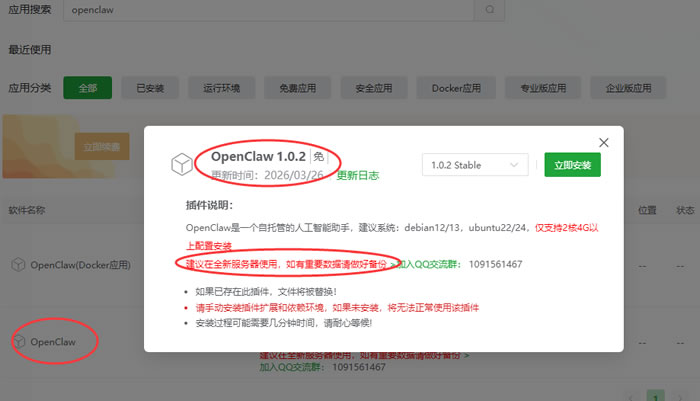 4)软件商店搜索OpenClaw,然后安装插件版OpenClaw 1.0.0(注意这个版本非docker版)