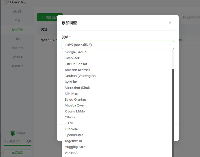 安装好之后,就可以使用啦,该插件默认模型为qwen3.5-plus,可以免费调用50次,这个当然不够用啦。我们需要自己添加一些模型。如果你没有就需要自己申请了,下面举例几个: