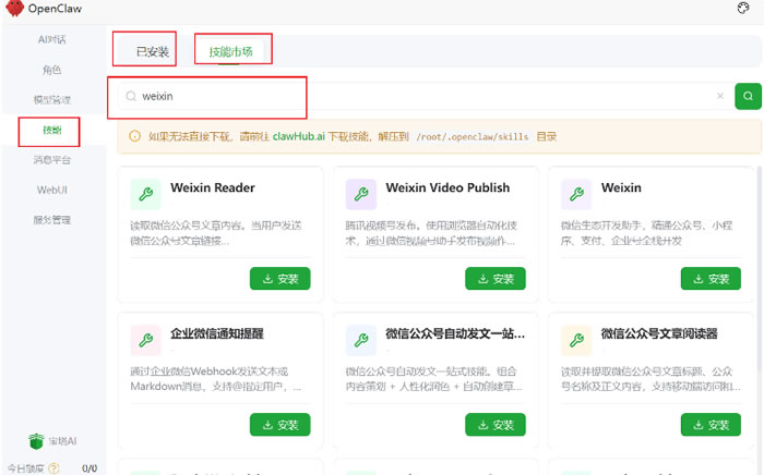 5)技能,这里可以直接搜索,安装,使用,看图: