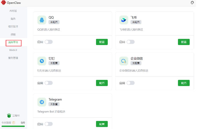 6)消息平台,这里有QQ、飞书、钉钉、企业微信可以自行配置: