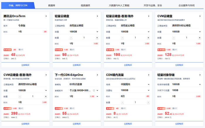 存储、数据库、视频通信等热门产品新用户专享特惠。