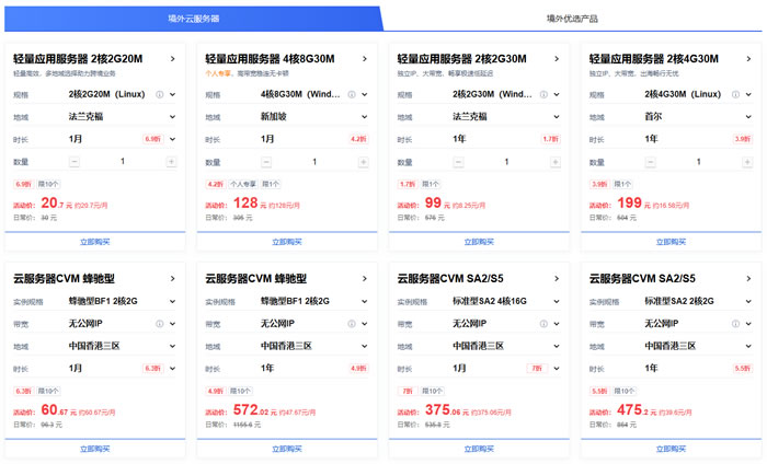 腾讯云海外云服务器轻量型提供多种产品可选,新加坡、美国、日本东京、法兰克福等机房位置可选,低至16.58元/月。