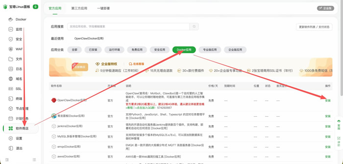搜索框输入 OpenClaw,找到标注 “Docker 应用” 的插件 → 点击安装。