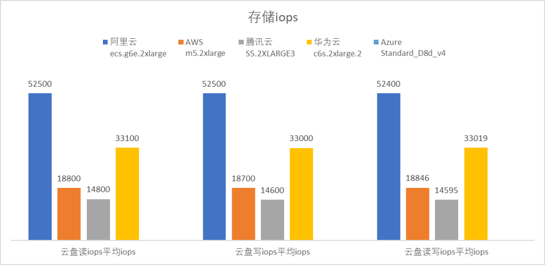 测试结果:阿里云g6e的网络PPS上明显领先,AWS m5和华为云c6s居中,腾讯云S5次之,Azure Ddv4明显落后。